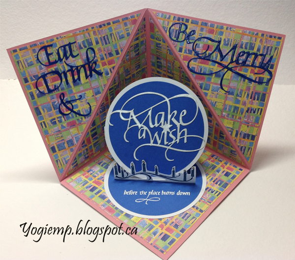 Inside: Die cut the "Eat, Drink & Be Merry" from the dark blue cardstock. Adhered to corners. Die cut the "Make a Wish" from white cardstock. Applied Versamark and embossed with Pearlescent embossing powder twice. Used my electronic cutter to cut the circle easel structure and front piece from white cardstock and the overlays from a mid toned blue cardstock. Scored, folded and adhered everything together and then onto the card floor. Stamped the candles on white cardstock, fussy cut around them. Applied Quickie glue to the candle bases and sprinkled with blue micro fine glitter. Added a small streak of Liquid Pearls "Buttercup" to each flame. Adhered to floor to act as my stopper. Stamped the sentiment using Distress "Picket Fence" and embossing with white embossing powder. Added a small piece of velcro on the left bottom square at the upper left hand corner to hold the card in place when open. Since this section is hidden I left it bare for a salutation or whatever... |