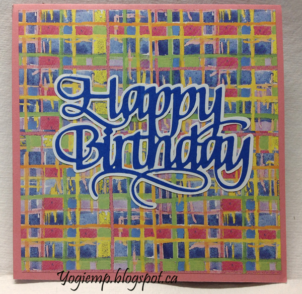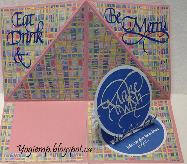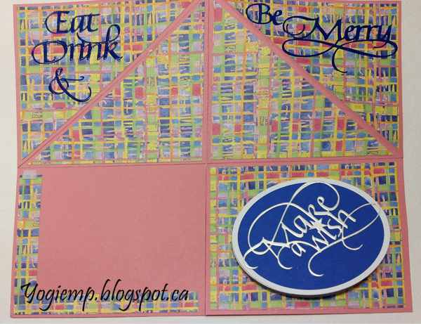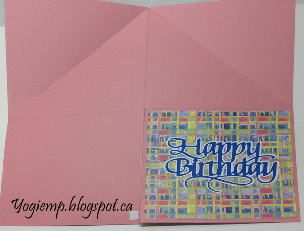 Scored and folded my pink cardstock. Fold in half both ways (vertical and horizontal). Fold upper squares in half to create triangles. Decorate the bottom right square for the front. I adhered a scrapbook paper (Provo Craft "Illuminations" 12"sq pad), both on the front and inside. Die cut the "Happy Birthday" from a dark blue cardstock and created a shadow layer from white cardstock. Adhered both to front.