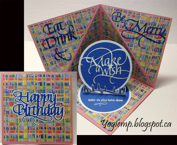 Created: May 29, 2019 A new structure for me that one of the gals showed at our last get together... so had to make one. Probably won't make another. You can't put 3D items on it or it won't close flat and I don't like that I can't see the front and inside at the same time. Sigh!! I'm using a several die sets "Happy Birthday", "Eat, Drink & Be Merry" 5pce set and "Make A Wish" from Elizabeth Craft Designs, also available from Quietfire Design HERE, HERE and HERE I'm using a clear quote and design element stamp from Quietfire Design "Happy Birthday Collection" 8pce set and available on Elizabeth Craft Designs HERE