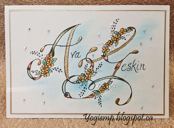 Drew the A & G intertwined. Inked with FW Acrylic ink "Sepia" with a fine pointed nib. Used Instacoll for the drop ends and Jerry Tresser adhesive for the other areas. Adhered 23kt Robertson warn gold leaf. Tooled a couple areas. Colored the flowers with Derwent Inktense watercolor pencils and a waterbrush. Added sprigs and pointed pen leaves. Sponged Distress Oxide "Broken China" very lightly around the letters. Added Liquid Pearls "White Opal" dots on some of the sprigs. Added mini gold nail art rhinestones to the flower centers using Gem-Tac adhesive. And Clear AB mini rhinestones around the background. Trimmed down and edged with a gold Krylon leafing pen. Adhered to card front. |