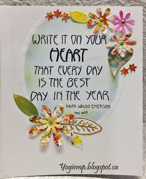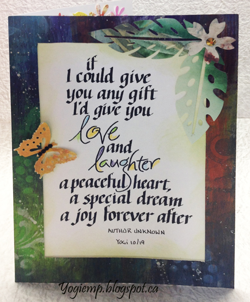 Scored and folded my white cardstock to create my side fold structure. Wrote out the sentiment using a flat edge pen and a Zig Writer in my upright Italic style and funky script. Scanned, resized and printed out on white cardstock. Colored some of the letters. Sponged around the edges and adhered to card front. Adhered my Deco Art frame. Added leaves, flowers and the butterfly from my stash. Added nail art rhinestones with Gem-tac.