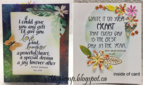 On the inside: Again my own calligraphy with a Zig Writer both the fine tip and bullet tip in an Art Deco style lettering. Scanned, printed on white cardstock, cut into an oval with a stitched oval die set, sponged with Distress "Twisted Citron" and "Salty Ocean" then adhered to inside. Added a bunch more flowers from my stash. Added some Liquid Pearls "Key Lime" to the flower centers. |