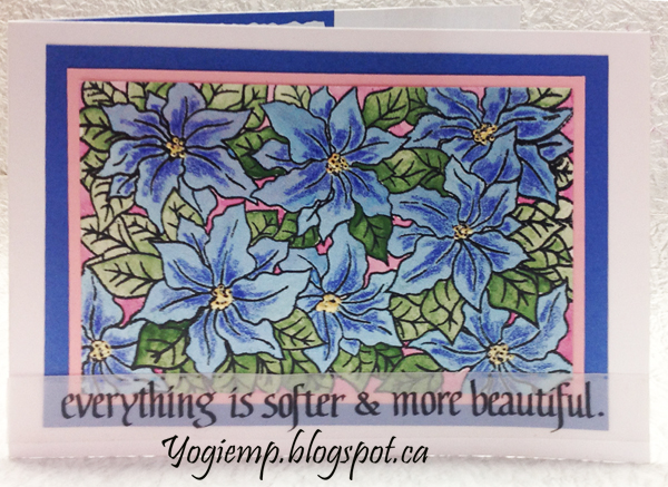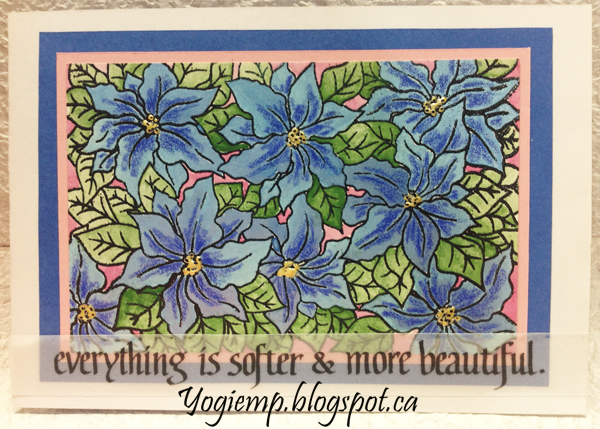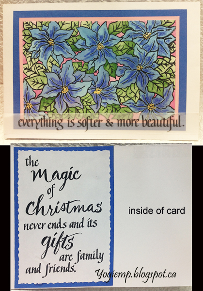 Scored and folded my white cardstock to create my side fold structure. Stamped the poinsettia on white cardstock (Woodware "Framed Poinsettia) usinf Versafine Clair "Morning Mist and embossed with black embossing powder. Painted with Fine-Tec and regular paints. Added Liquid Pearls "gold" to the flower centers. Trimmed down and adhered to a pink then a blue background, then onto card front. Had this sentiment on my desk from a previous printing on vellum, so adhered it to the card front (my upright italic style...) |
