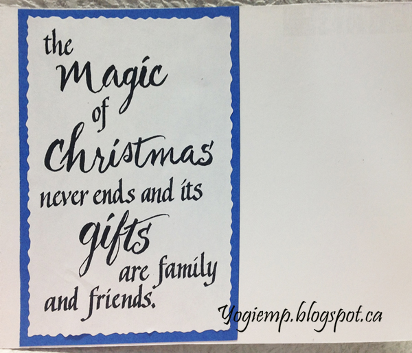On the inside: Again my own calligraphy with a brush pen and a flat edge pen, scanned, printed on white cardstock, cut into a rectangle shape with a deckle edge rotary cutter, then adhered to a blue under mat. Adhered to inside. |