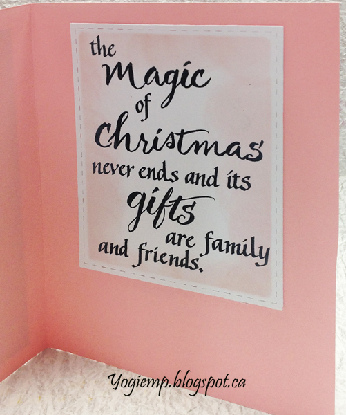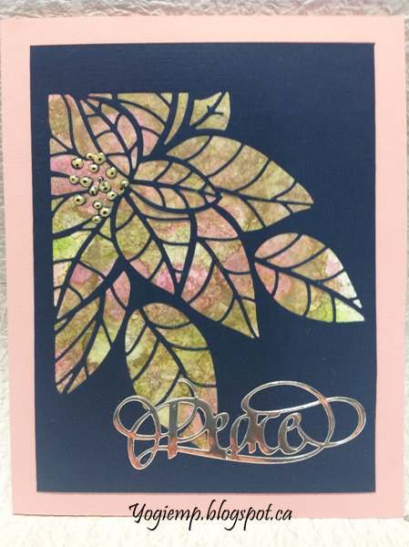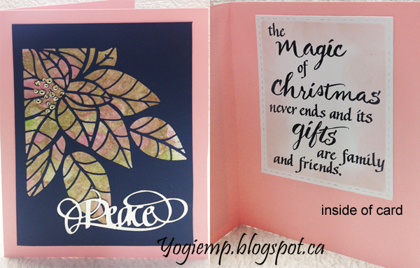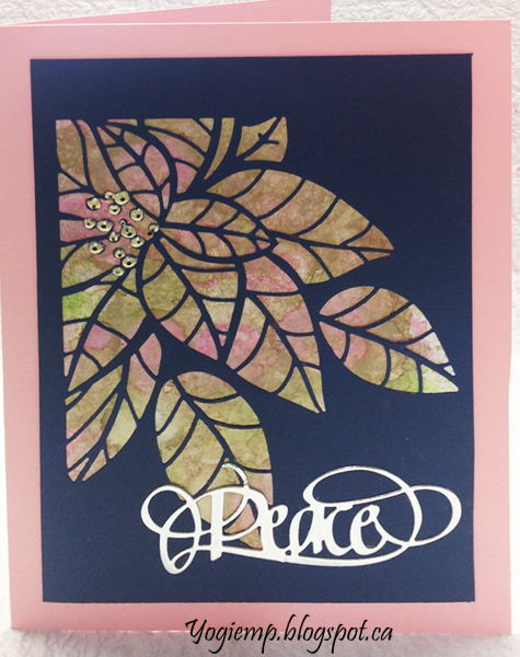 Scored and folded my pink cardstock to create my side fold structure. Created an alcohol ink background with the pearl inks. Die cut the poinsettia from black cardstock, trimmed down adhered to the alcohol background then onto card front. added Liquid Pearl gold dots and when dry addad a small black Sharpie dot. Die cut the "Peace" from DoCraft silver mirror cardstock.