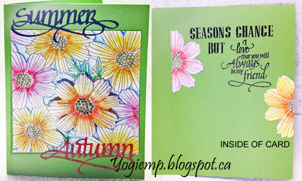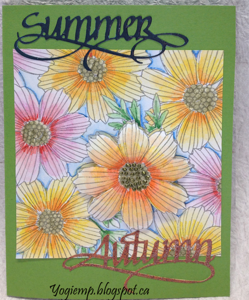 Scored and folded my apple green toned cardstock to create my side fold structure. Stamped the flower background (twice) onto white cardstock using Versafine Clair "Morning Mist". Colored with Derwent Inktense watercolor pencils and a waterbrush. On the 2nd stamping colored only a couple of the flowers and fussy cut them out. Trimmed down and adhered to card front. Adhered the full flower image using 3D foam tape. Added Liquid Pearl dots (avocado) to the flower center. Die cut the "Summer" and "Autumn" from cardstock and inked the Summer with Versafine Clair "Twilight" and clear embossed. The Autumn inked with Versafine Clair "Meadow" and embossed with Emerald Creek "Desert Clay" embossing powder. |