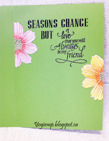 On the inside: Stamped the "Seasons Change But" using Just Rite "Brayton" alphabet set and the quote and inked with Versafine Clair "Fallen Leaves" and embossed with Emerald Creek "Oil Rubbed Bronze" embossing powder. Adhered a couple of the partial flowers from the background stamp. |