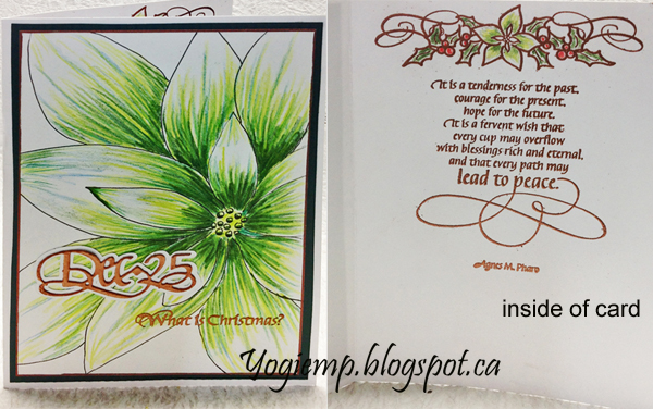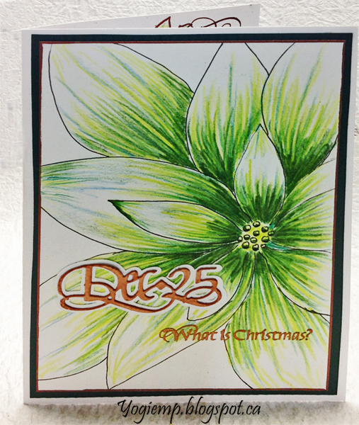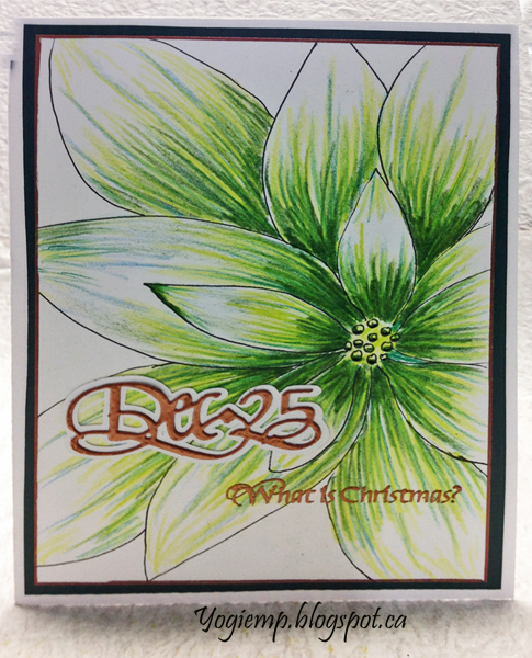 Scored and folded my white cardstock to create my side fold structure. Drew the poinsettia and outlined with a black Zig writer. Colored with Prisma colored pencils. What I really liked about the card by Laura was the linear coloring method. I don't think I've ever done that before. Trimmed down and added a Krylon Copper edge. Adhered to a dark green texture cardstock and then onto my card front. Stamped the "What Is Christmas" using Versafine Clair "Summertime" and embossing with Emerald Creek "Kettle Copper" embossing powder. Die cut the "Dec 25" from white cardstock, inked with the Summertime and embossed with the Copper. Adhered to a shadow layer (technique for creating a shadow layer HERE) |