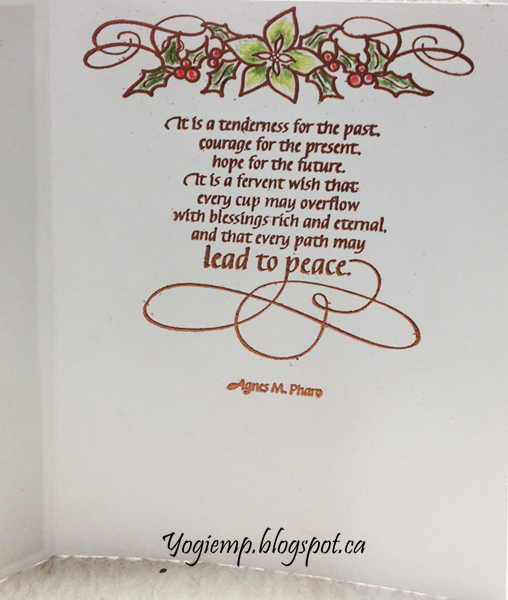 On the inside: Stamped the banner and quote with the Summertime, embossed with the copper. Colored with Prisma colored pencils. |