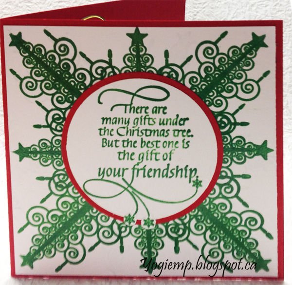 Scored and folded my red textured cardstock to create my side fold structure. Cut a piece of white cardstock. Penciled in lines diagonally (corner to corner) and horizontally and vertically. Cut a circle from thin paper and placed in center (wasn't sure if I wanted the center blank or not...). Inked my stamp with Versafine Clair "Green Oasis", positioned it along one of the pencil lines and stamped. Repeated on each pencil line creating the motif then clear embossed. Stamped the quote using the oasis, clear embossed and die cut with a circle die set. PS the circle was a touch smaller than the whole quote so cut around the bottom little stars to fit n top of my die. Cut a circle from the red texture cardstock and adhered both together then onto the motif piece, then onto the card front. |