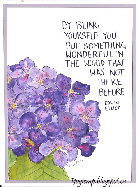 Drew the Hydrangea onto CP watercolor paper using a black Micron pen. I used Daniel Smith water colors (see image below for pic of my palettes) to paint my flowers. Assed Liquid Pearls "Buttercup" dots in the flower centers. Wrote my text using a Zebra G nib with pink "Purple Lake" FW acrylic ink in a monoline lettering. Trimmed down and adhered to a lavender cardstock then onto my white cardstock card.