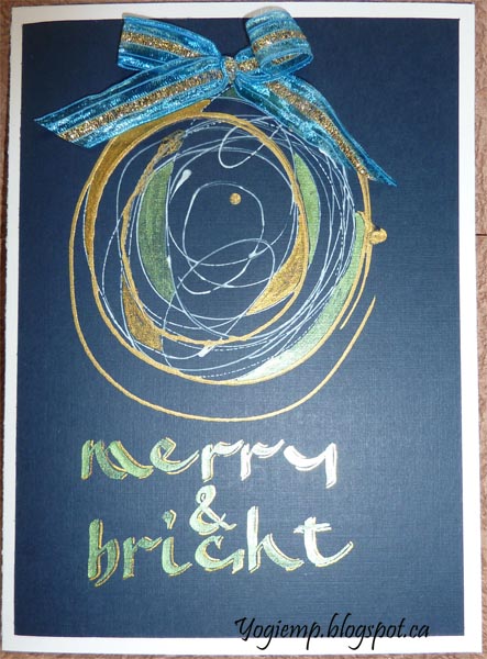 On Dreamweaver packaging Created my ball using Daniel Smith Gold Gesso. Then overlapped it with a white gesso. Painted with Gansai Tambi metallic colors in a green and a gold. Wrote out the words with the same colors and a parallel pen. Added a blue/gold Sari bow. Adhered to a white cardstock. |