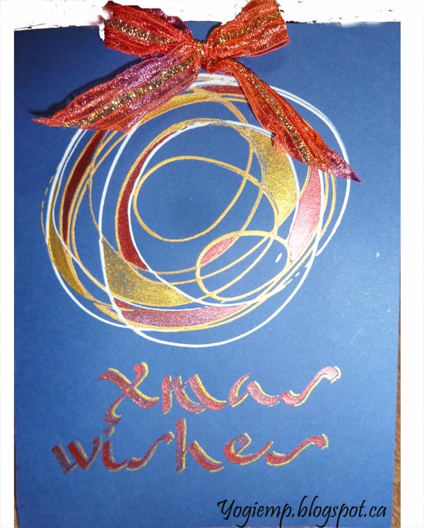 ID: Crazy Illumination - Xmas Ball Red/Gold On blue cardstock created my ball using Daniel Smith Gold Gesso. Then overlapped it with a white gesso. Painted with Gansai Tambi metallic colors in a red and a gold. Wrote out the words with the same colors and a parallel pen. Added a red/gold Sari bow. Adhered to a white card base