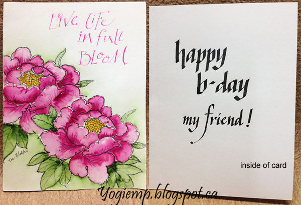 Found the image of the peonies online and manipulated it and overlapped them. Printed it out on Canson Biggie cp w/c paper. I used Winsor and Newton water colors to paint my flower. Wrote my text using a Zebra G nib with Holbein "Opera" gouache in a monoline style. Adhered to a white cardstock card. Words: Live Life In Full Bloom