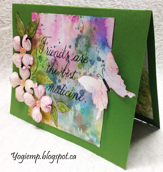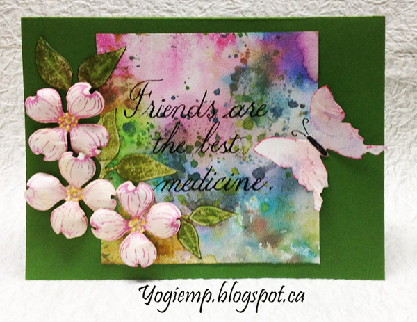 Medicine Here is the link to the Grunge texture technique tag I made and then cut up for this card." TH - Distress Grunge - Distress and Oxide Pad" Wrote in my words using a Zebra G nib and Sumi ink in a Copperplate style. Adhered to a green top fold card. Added some dogwood blooms from my stash as well as a die cut textured butterfly. Added some Perfect Pearls "Buttercup" dots to the flower centers. Words: Friends are the best medicine. |