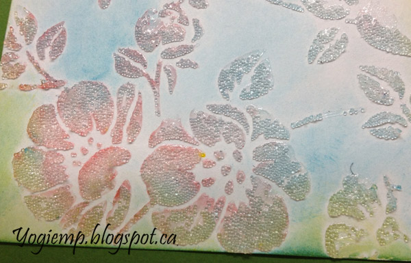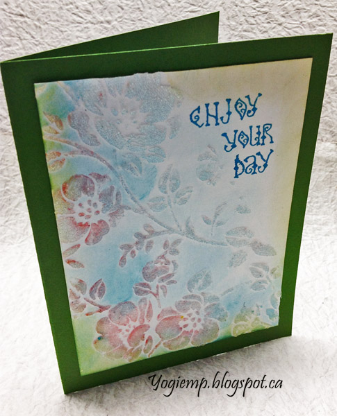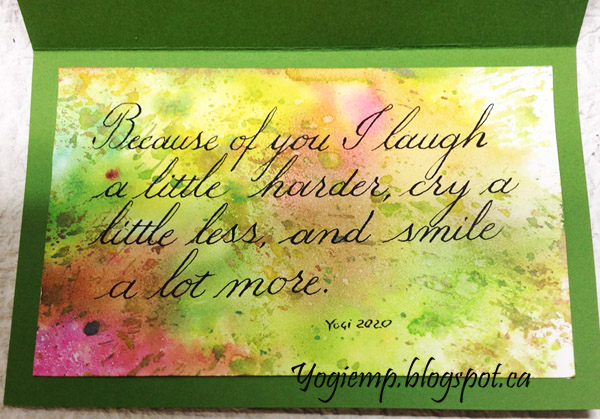 You Day Applied Golden Glass Bead paste through Tim's "Floral" stencil on 110# white Staples cardstock. Let dry then sponged various Distress pad colors. Wrote in my words in a funky style using a Zebra G nib and blue watercolor (which bled a bit - sigh) |