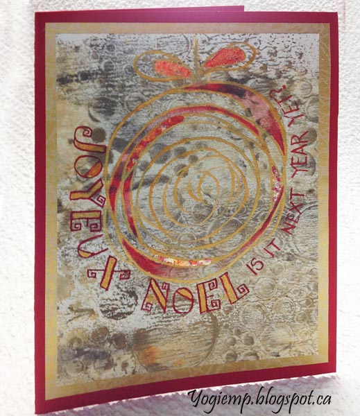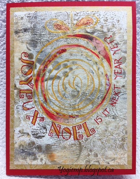 I had left over geli prints done on Arches Text Wove, so decided to use some of it. Using a pointed pen and FW acrylic ink "Autumn Gold" drew my circle design. When dry gilded some areas with variegated Red Leaf. Colored in some areas with Derwent Inktense red pencil. Wrote my "Joyeaux Noel" with Holbien gouache (Flame Red) and painted with the gold. Adhered to a patterned gold wrapping paper and then onto my red textured cardstock. |