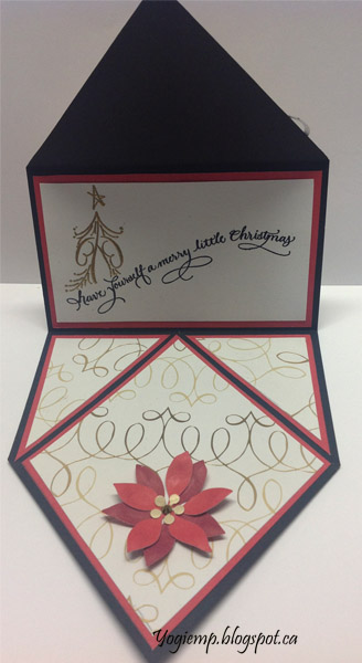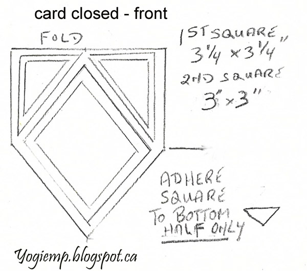 Cut red cardstock 3.25"sq and adhere to card front on the bottom half of the square only. Cut the decorative cardstock to 3"sq and adhere to red piece. Cut diamond pieces as per the inside pieces. |