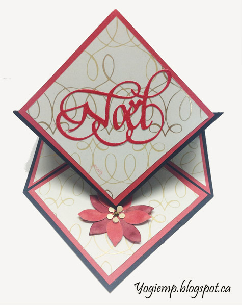 ID: Diamond Easel Card - Noel Constructing the easel and added my decorative squares. Die cut the "Noel" (Elizabeth Craft Designs "Quietfire Design - Noel" die) from white "Bee Super Deluxe" paper. Inked with Versafine Clair and embossed with Emerald Creek - Boho Bleds "Paprika" embossing powder. Adhered to card front. Die cut the poinsettia (Sizzix small poinsettia) adding a gold mini nail art jewel and adhered to base of card as my stopper.. |