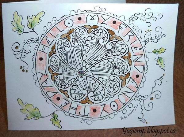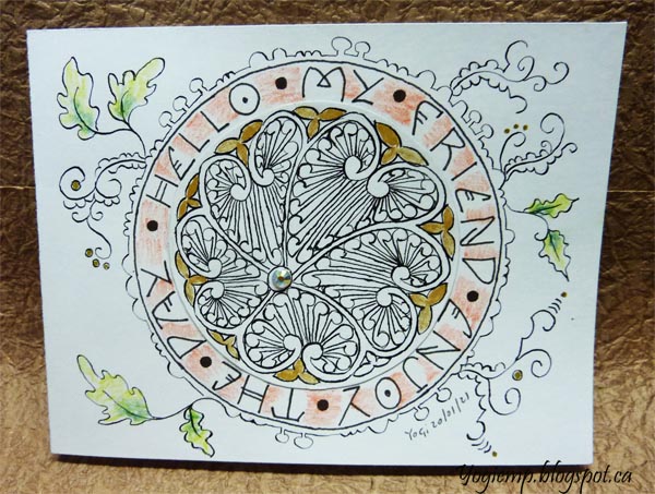 Drew my outside circle and add the lettering with a Zig Writer. Doodled around the edge with a very fine pointed nib and Sumi ink, lightly colored some of the leaves and between the lettrs of the words with Koh-I-Noor woodless pencils.