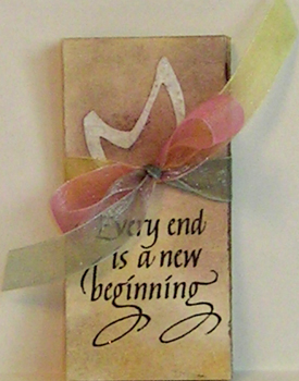 I punched out the letters for the word "Memories" using my Cuttlebug and a new set of Sizzix Sizzlets alpha dies "Sunset #654882" from some white gold flecked textured paper. Also added a bit of a lace doily using Martha Stewarts "Doily Lace" border punch. Tied everything together with a translucent variegated ribbon. |