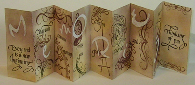 Created: May 31, 2009 I used a cream toned cardstock, cut in half lengthwise and then folded accordion style, added the next piece of cardstock and continued folding until I had the length I wanted. I colored the cardstock with Pan pastels in brown shades, leaving the central portion of each folded page with very little color so it almost glows. I rubber stamped the quotes (All from Quietfire Design) with Versafine stamp pad with both the Vintage Sepia and Spanish Moss. All the other images and words were done with the same stamp pads. |