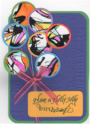 This card was mailed in for the theme of "Happy Birthday" at Scrap & Stamp magazine but ended up in Just Cards. I did my straw art on glossy white cardstock using black Sumi ink dropped blobs on the paper and blew through a straw to disperse the ink. The patterns it created were just great. I had also gotten some copic markers recently and decided to color in spaces using them. I then punched out the circles, mounted them slightly larger bright colored cardstock. Ran the blue cardstock through my Cuttlebug with the Happy Birthday folder, rounded the corners with a large corner rounder, mounted that to a matching green main card also rounded the corners. Adhere the circle shapes (faux balloons) adding waxed linen thread to hold them and a pretty pink bow. The words (Quietfire Design) are rubber stamped on a nice golden cardstock with Versafine and clear embossed . |