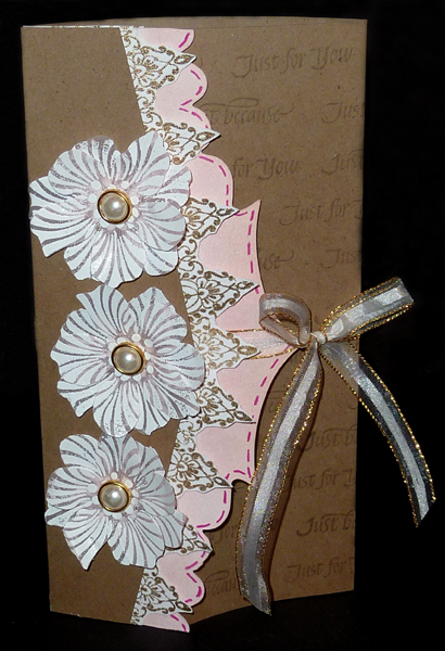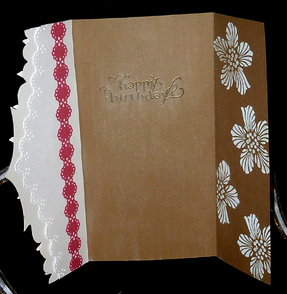 Scored and folded my Kraft cardstock to create an envelope structure, then cut away on the left piece to create the point of a flap. repeatedly stamped the sentiment words "Just Because" & "Just for You", off setting them on each line and using distress Pumice Stone. Stamped the lace border (Chocolate Baroque "Damask Squares" set with Versafine "Toffee and embossing with gold embossing powder. Note: I drew the contour of my flap onto white cardstock, masked the point area, to stamp only one lace picot, then used the line as a guide for stamping along the slope. Trimmed it down to fit the inside the flap right to the fold line. Adhered to card front. Adhered the ribbon between this border layer and the next, wrapping the ribbon around the card and cutting a slit on the left fold edge to slip it through. Die cut the under border using Tim's On the Edge die "Ornate", again drew a guiding line, and using the "Scallop" On the Edge die to continue my border matching up the last scallop from the first die cut with a scallop from the next die. Repeating the process for the other side. Sponged it completely with Distress "Worn Lipstick and added deep rose colored pencil faux stitching. Again trimmed to fit right to the fold line.