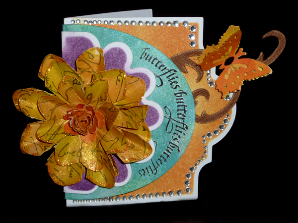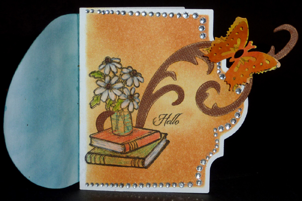 Sponged Distress Mustard Seed and Wild Honey, using the die as a mask. Stamped the vase/books and the word (Flourishes "From the Desk of" #144) with the black and colored with Prisma colored pencils. Die cut the flourish (Sizzix Tim's "Elegant Flourishes") from Core D'nations a dark brown (Elements pad) and sanded the edges. Adhered to card page cutting the flourish so it appears to fall behind the books. Punched out the butterfly (EK Success Butterfly layer Punch) from some scraps from the flower paper. Adhered to flourish and added a black rhinestone. Added clear rhinestones along the page edge. |