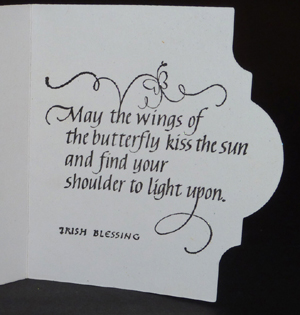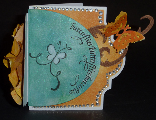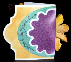 Created: January 2, 2012 I don't do too many cards that are 4.25 x 5.5" , but the challenge for the month is to make something even smaller than that, like an ATC or small card etc. I've made enough ATC's... so went to making a card. It's a multi page card so feels bigger. BIG GRIN. It's my submission for the Vamp Stamp Magazine for the March 2012 issue with the theme of "Small Size". The quote, word and small butterfly on the inside are the latest stamps by Quietfire Design - gorgeous.