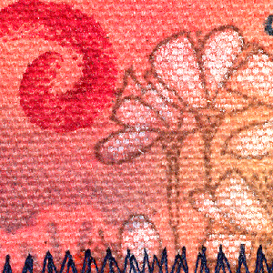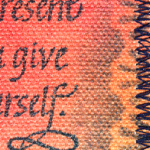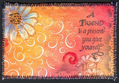 Rubber stamped my large Flower (unknown by Anita's Back Street) and the small grouping of flowers (Old Island #727) with Versafine Vintage Sepia and clear embossed it. The embossing sinks into the fabric, but that's ok. It helps to give a permanence to the stamped image. I then colored in the stamped images with Prisma colors, first laying down a layer of white, then colors, then blending with white again. The red swirl is a punched out foam piece stamped with red paint. The quote is from the Friendship Quote Marks set (Quietfire Design) and stamped with the Sepia. |