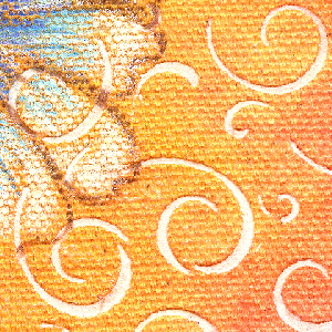 I thought I'd make a postcard that didn't use conventional cardstock but rather canvas material used in the garden. I painted a larger piece than I needed with Golden's Fluid Acrylic paints diluted to a milk consistency. Misted my canvas and then just lay down my colors, one next to the other so they bled and merged. I didn't over paint very much. I wanted clean colors. Let that dry. I then used a Dreamweaver brass stencil of a swirl design LJ855 and white molding paste. Cleaned my stencil immediately. Let that dry |