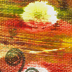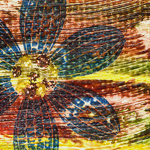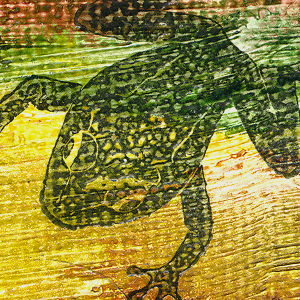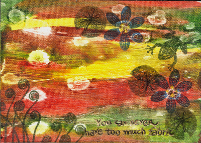 This time I thought I'd use artist grade pre-primed canvas material for my postcard. It's only primed on one side and didn't feel as stiff as I would like. So I painted both sides with several more layers of Gesso. I used Utrecth's white gesso, which is a very thick quality, almost as thick as molding paste. Dried it thoroughly between layers. Diluted my Golden's Fluid Acrylics (Indian Yellow, Quinacridone Burnt Orange, Green Gold, Jenkin's Green) to a milk consistency and applied my paint in a thin layer, then almost immediately dropped drops of rubbing alcohol on the moist paint (with a fine tipped eye dropper and also with the tip of a bamboo skewer dipping into the alcohol and onto the painted surface repeatedly). It dissolves the paint in that area, leaving a white open area with sometimes some of the color remaining. Almost looks like flowers, which is how this postcard evolved. I was looking at what I had done, seeing these white spots, and then I saw this lily pond taking shape in my mind. |