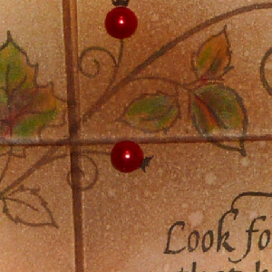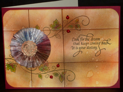 I scored and folded my burgundy/grey two tone card. Cut a piece of white cardstock to size and rounded the corners, then scored my lines. Sponged Distress Mustard Seed, Walnut Stain, and Wild Honey, concentrating the Mustard all over, the walnut at the score lines and intersecting line and the Honey around the edges. Misted and dried. Stamped the quote (Quietfire Design) with Versafine Black Onyx. Stamped the Fall Flourish (Great Impressions) with Vintage Sepia & touched sections with the black, then repeated the stamping in another area. Colored the leaves with Prisma Colored Pencils. adhered this layer to the main card. |