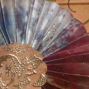 Created the Rosette from a piece of thick rice paper I had in my scrap drawer. It was a serendipitous piece. It was the underlayer of another piece which I had saturated with various colored inks and they bled through to the underlayer. Anyway, I cut the piece to 1" x 12" and scored at 1/4" intervals until the end. Adhered both ends together, then adhered the center to a piece of scrap circle. Let that dry, then adhered a decorative scalloped circle to the top and then onto my card. As a final touch add the red half pearls to where the berries are on the stamped image. |