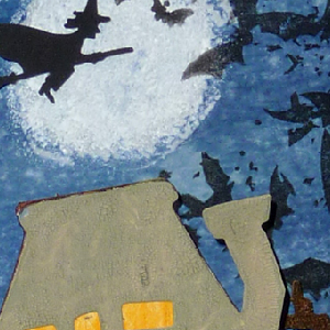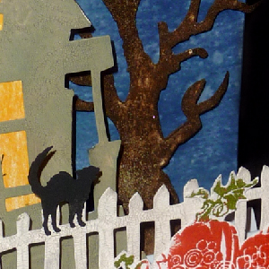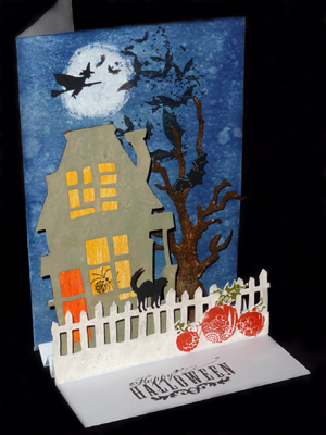 I cut a piece of 12 x 12 pale lavender cardstock down to a size of 10 x 12, then cut away a 5 x 5" corner. Scored the hanging end at 1/2" intervals to make 3 easel mountains and then left the rest unscored for my quote. Scored the vertical to make a 5 x 7" card. I die cut the house, bare tree and fence All from Tim's dies and used white cardstock. The fence was painted with Distress Crackle Picket Fence and sponged with Pumice Stone; The house with the Old Paper and sponged with Weathered Wood. Traced around the house to make a solid backing, cut out and colored the window & door areas with colored pencils, then adhered to die cut piece. The tree was direct to paper with Frayed Burlap, Brushed Corduroy and Walnut Stain, then embossed with Distress Vintage Photo & Old Paper. Punched out the Witch, cat & bat from black cardstock using Martha Stewart punches. I stamped the moon with Perfect Medium and clear embossed. Used Distress stamp pads, direct to paper on the sky (Stormy Sky, Faded Jeans & Chipped Sapphire, misted with water and dried. Ironed off the embossing on the moon and painted with a white "Snow Cap" Dauber. Stamped the spray of bats with Versafine Black onyx. Stamped the pumpkins (Inkadinkado) with Perfect Medium and embossed with Stampendous Embossing powders in orange and green. Adhered to my fence. I adhered my house, fence & tree to the various easel mountains, then adhered the witch with a 3D pop dot to the moon; the bat with 3D pop dots to the tree. The cat directly to the fence. I stamped the Happy Halloween" with the black.