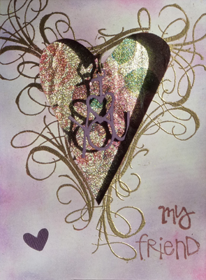 Created: December 19, 2009 I placed my cardstock on my Cricut mat and cut out my heart window. Sponged Kaleidacolor "Birthstone" around the edges. Scored and folded my card. (note: the front is a touch larger than the inside and the inside flap is a touch smaller than the width of the card). Rubber stamped the small Flourish ( Quietfire Design ) several times around the heart with Versafine "Crimson Red" and thermal embossed with Queen's Gold. Rubber stamped and embossed "my friend" (Michael's Bargain stamps "Kolette Hall") with the same colors. Cut out the "I Love You" charm with the Cricut on purple Bazzill Monochrom cardstock and attached it to the card with a Junkitz Ringz. Also adhered the small purple heart, dropped out of the words |