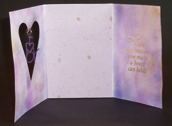 The flap that the charm rests against when the card is closed is covered with a floral foil paper in pinky tones. (very hard to scan or photograph) I added a mauve toned gold speckled stationary paper on the center panel to write a personal message. the other two inside flaps were sponged with the same colors as the front. On the right hand side is a quote (Quietfire Design "No one can measure"), stamped with the Crimson and embossed with the gold. |