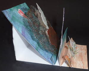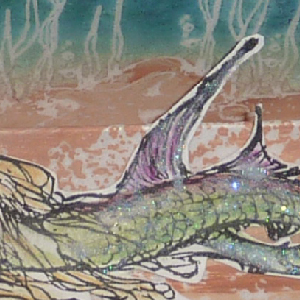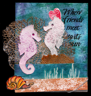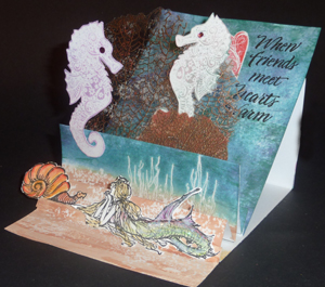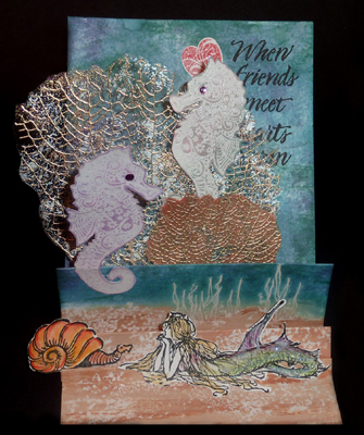 I stamped the foreground of the step cardstock with beach sand (Starving Artistamp) and sea bottom flora (Onyx Xpressions) and clear embossed them, then painted over it with Ceramcoat Delta acrylic paint in a flesh tone and then streaked it with a deeper mocha, aloowed it to dry a bit then wiped off the paint from the embossed areas.