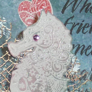 Stamp the Seahorse on white cardstock with Perfect Medium and clear emboss. Apply Distress pads direct to paper, Spun Sugar, then some Dusty Concord. Dry and with damp cloth remove paint from embossed areas. The reverse seahorse was stamped on to a plain piece of rubber, then onto the white cardstock. Continue as above, but instead of the Dusty Concord, use the Pine needles to give a bit of variance. Add a gel dot eye to each seahorse. |