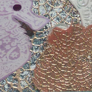 Stamp the Large & Small SeaFans on Graffix clear craft plastic with Perfect Medium and emboss with the gold. Careful - start heating from a distance, until you see the embossing powder start to react, then move closer. Cut out around the seafans with sharp scissors. On the large seafan, apply spots of Pearl dabber on the backside, leaving clear areas. While wet, apply some of the copper, mingling the two colors, and leaving lots of clear areas. On the small seafan use the copper only and make it more opaque, but still leave some open areas. Let dry. |