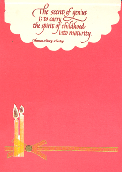 I adhered the back of the front scalloped piece to the front of the Happy Birthday embossed piece. And the back of the back portion of the scalloped piece to the front of the red cardstock, centering it. So now you have the hinged portion attached to both parts of the card. On the inside scallop piece I rubber stamped the quote (Quietfire Design) with Versafine Satin Red and clear embossed it. I had a couple candles left over from my front piece which I adhered to the inside. I rubber stamped the ribbon (Perfectly Clear Stamps "Ribbon Bow Border" #SSC058) with the same Kaleidacolor stamp pad and clear embossed it, then outlined it with a gold gel pen, and added a gold Peel Offs dot. |