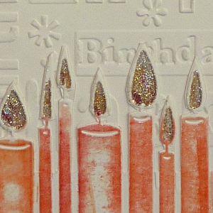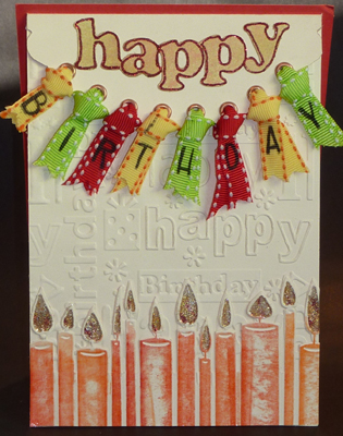 Created: February 6, 2010 I scored & bone folded a piece of cream cardstock in half, drew a scalloped rounded shape on it then cut it out, both portions together (this is the hinge for the front and inside of the card). Punched large holes on the front portion only to fit the copper eyelets (I think 3/16) I was using for the thickness of ribbons. Inserted the ribbons into the holes, then rubber stamped the letters to spell "Birthday" (various stamp alphabets) using Versafine Black Onyx and clear embossing them. Used my Cricut to cut out the word "Happy" using Cooper Black font and the weld feature, from some cream cardstock painted with Twinkles H2o's (golden pinky tones). Then outlined each letter with a Quickie Glue pen and sprinkled Rtiz micro fine glitter Regal Red. Adhered it to the scalloped section. Set this aside. I ran another piece of cream cardstock slightly smaller (4.75 x 6.75") than my main card through my Cuttlebug with the Happy Birthday #37-1133 embossing folder. Ran another piece using the Birthday Wishes #37-1162 embossing folder, brayered the high points with Kaleidacolor "Desert Heat" then clear embossing it. Cut out around the open sections of the candles, leaving the bottom portion intact. Used a Quickie glue pen and Ritz Micro Fine glitter Dark Gold and some Regal Red for the flames. Adhered it to the birthday section cutting off part of the bottom since it was taller than I wanted for the card.
