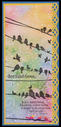I stamped the upper portion (about 3/4 of the stamp) of the bird stamp onto the scrapbook paper (Provo Craft Pathways "Illumination" pad with Versafine Black Onyx. Wish they still made this paper, it's one of my favorites. Then stamped the "best friends" then stamped the other portion of the bird stamp, then the quote. Trimmed the paper down to size. Punched out the border with Martha Stewart Punch Around the Page "Swirling Lace", adhered my bird piece very close to the punched edge, then trimmed the other sides. Adhered it to my main side folded card. Punched out the birds with Martha's "Bird on Wire" edger from some decorative scrap paper. Extended the wire lines with a Zig Writer. |