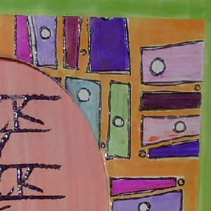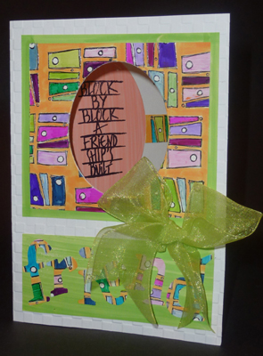 Created: January 9, 2011 This card was colored with Bic Alcohol Markers & Tombow Watercolor markers. I rubber stamped the block pattern (Sunshine Designs set #SD CRS047CU) repeatedly on a white glossy paper, I believe called Luna (larger than what I needed) and clear embossed them. I then just colored them in with random Bic marker colors to create a happy color scheme. The orangey background is a bright yellow Tombow marker. I cut the piece to size and adhered it to another piece of glossy paper colored with green Tombow marker. |