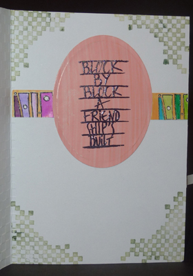 The word "friend" was cut using Sizzix "Fun Serif" lower case letter set #38-0608 from a part of the cut off colored piece from above. Adhered them to another glossy paper colored with a green Tombow. The white card was run through my Big Shot using the Checkerboard folder from the "Everyday bundle set #371956. I adhered the decorative pieces to the card, then used a Spellbinders Oval die set to die cut the window. I also die cut the next size up from a piece of the glossy paper and colored it with a peachy Tombow marker. Stamped the quote (one of my calligraphic clear quote stamps), using Versafine Black onyx and clear embossing it. Adhered a strip of some leftover decorative paper on the inside, then adhered my oval, lining it up to the window opening. Tied a big bow and adhered it to the front with Sookwang tape. On the inside, I stamped the block corners (Quietfire Design) with Versamagic stamp pad "Tea Leaves" all over and then touched it with Brilliance "Pearlescent Ivy" here and there. |