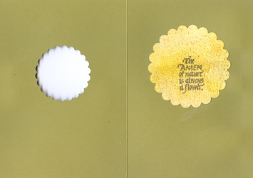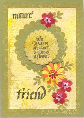 Created: June 20, 2009 I love this background. I brayered (rubber one) Golden's Light Molding paste onto a piece of Canson "Biggie" 90# watercolor paper (wrong side, it's smoother). I love the texture it created. I then brayered Distress Reinkers (foam one) over the dried molding paste. Several colors letting colors dry between applications. Careful not to press too hard with the overlaying color or it will remove the one below. I then brayered a mix of the Tim's Distress Ink/Perfect Pearls mixture to get that nice shimmer. I used my Cuttlebug and Nestabilities Classic Scalloped large circles to die cut the various sizes. First from the background paper with the third largest one. Adhered the background to a decorative gold leaf paper and cut the next sized circle. Adhered these to the bazzill cardstock and cut the next size circle. Adhered the drop out from the first layer to the inside of the card and within the confines of the cut out circles. I then rubber stamped the quote, Quietfire Design, with Versafine "Spanish Moss" (while the card was closed). |