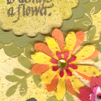 I punched out various elements of floral petals and leaves (Marvy - 2 sizes of Daisy flowers, Carl punches - Sakura flowers, EK Success - Rock Fern) and adhered them to the card adding a faux rhinestone in the centers of each flower. Rubber stamped the other 2 words (also from Quietfire Design) with Versafine "Black Onyx"