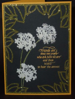 Created: June 6, 2011 This is another of my submissions for the Vamp Stamp Magazine for the August 2011 issue (but it seems it didn't get put in or put on the web page...) with the theme of "Solid Stamps". This card uses my Cricut, and am using the negative portion of a leaf frame. It's a simple design created with the bullet tip of a Zig Writer.