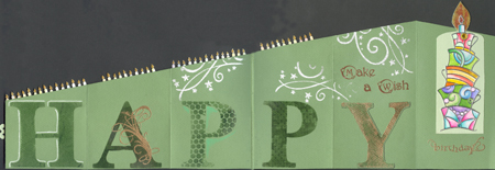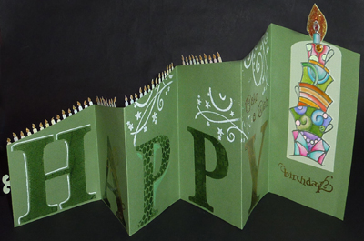 Created: March 15, 2010 Score & fold a 7"h x 25" green cardstock starting with a 1/2" fold for a tab, then every 3.5" to create an accordion folded card. You should end up with 7 pages plus the tab. Open it up to lay flat and cut on the diagonal with the small end being 4.25"h (this is the tab end) and the high end being 7"h. Fold the last two pages together and draw a light line onto the last page using the previous page as a guide. Cut off the top section so when card is folded closed, the last page is the same as the previous page.